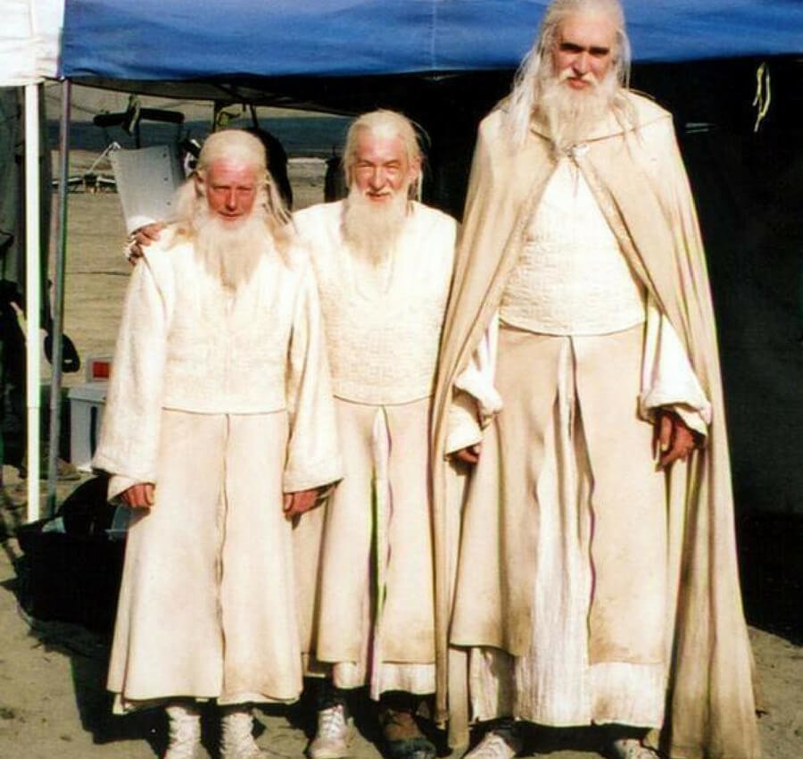 This is a photograph of brilliant English actor, Ian McKellen, with his stunt doubles. If you’re clever enough to have spotted the odd boot worn by McKellen, this is an old trick used in the set so the directors would know which of the men is the main actor. So nothing gets muddled in the middle of the shoot.